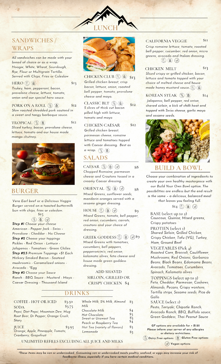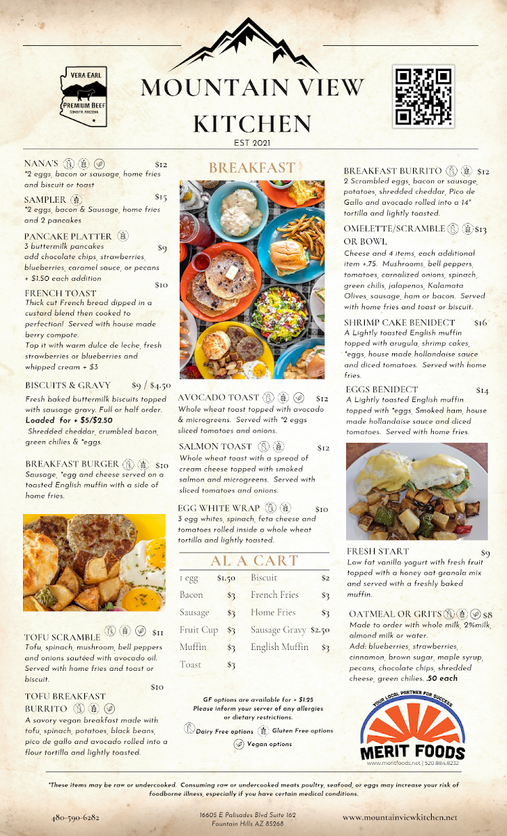 The menu at Mountain View Kitchen offers a variety of delicious options, catering to both adults and kids. For drinks, you can enjoy a range of beverages like Water, Coffee, Decaf Coffee, Soda, and the refreshing Arnold Palmer. Kids can choose from options like Kids Orange Juice, Kids Apple Juice, or classic sodas such as Kids Pepsi and Kids Diet Pepsi. Breakfast options are hearty and flavorful, with choices such as Avocado Toast, the indulgent LOADED Biscuits & Gravy, Biscuits and Gravy, and the satisfying Breakfast Burger. For a lighter breakfast, the Breakfast Burrito is also a great pick. The kids’ breakfast menu includes favorites like the Jr. Sampler, Rainbow Slam, and Happy Day Platter, along with Kids French Toast and Kids Cheese Quesadilla. For lunch, the Build A Bowl allows for customization, while the California Veggie Sandwich, Chicken Caesar Wrap, and Chicken Club cater to those craving a savory meal. You can also try the Chicken Melt or the classic BLT. The My Burger is a popular choice, offering a delicious, customizable option. For sides, customers can enjoy items such as 1 Egg, 1 Pancake, or additional choices like Add Cheese or 2 Eggs. Overall, Mountain View Kitchen presents a well-rounded menu filled with fresh and satisfying options for all ages and tastes.